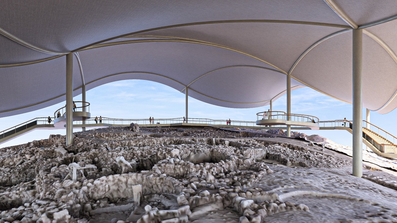 Η κατασκευή του στεγάστρου, που θα καλύψει περίπου 5.000 τετραγωνικά μέτρα, αποσκοπεί στην προστασία του ιστορικού χώρου από τις περιβαλλοντικές συνθήκες. Η κυματιστή μορφή της οροφής παρουσιάζει οργανική αρμονία με το έδαφος, ενώ ενισχύει την άνεση κατά την περιήγηση στον χώρο χάρη σε ανοίγματα που παρέχουν φυσικό αερισμό. Επιπλέον, η σπονδυλωτή κατασκευή θα διατηρήσει τον μοναδικό χαρακτήρα του χώρου των ανασκαφών, ελαχιστοποιώντας τον αριθμό των στηλών και επιτυγχάνοντας μια ισορροπία ανάμεσα στην αισθητική και τη λειτουργικότητα. Τέλος, ο σχεδιασμός θα επιτρέπει ευελιξία για μελλοντικές επεκτάσεις, ανάπτυξη και προσαρμογή του στεγάστρου καθώς συνεχίζονται οι ανασκαφές.