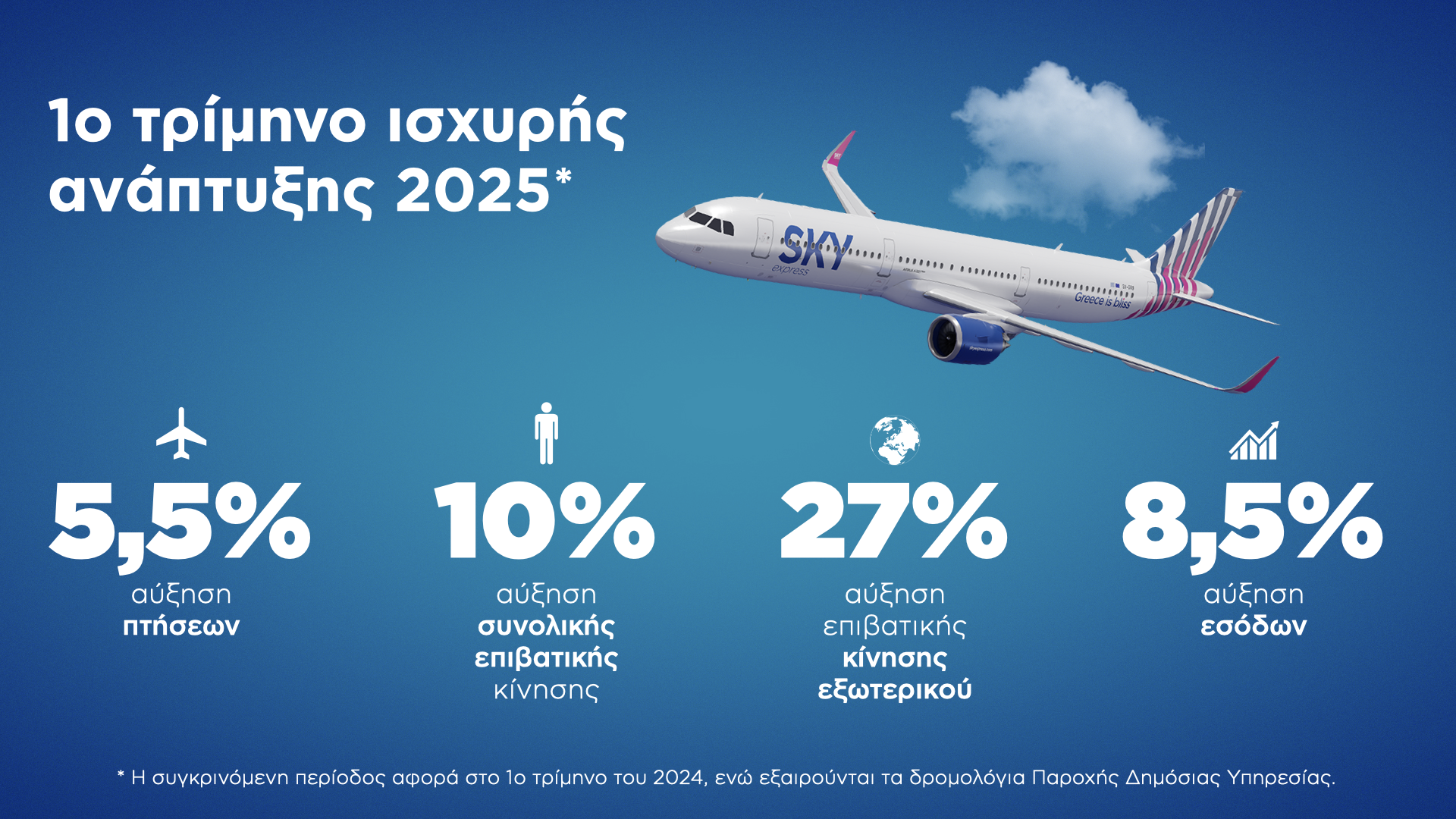Με δυναμική εκκίνηση ξεκίνησε το 2025 για τη SKY express, καταγράφοντας ισχυρή ανάπτυξη σε όλους τους βασικούς δείκτες. Κατά το πρώτο τρίμηνο του έτους, η εταιρεία σημείωσε άνοδο 10% στην επιβατική κίνηση και 8,5% στα έσοδα σε σύγκριση με το αντίστοιχο διάστημα του 2024, επιβεβαιώνοντας τη σταθερά ανοδική της πορεία.