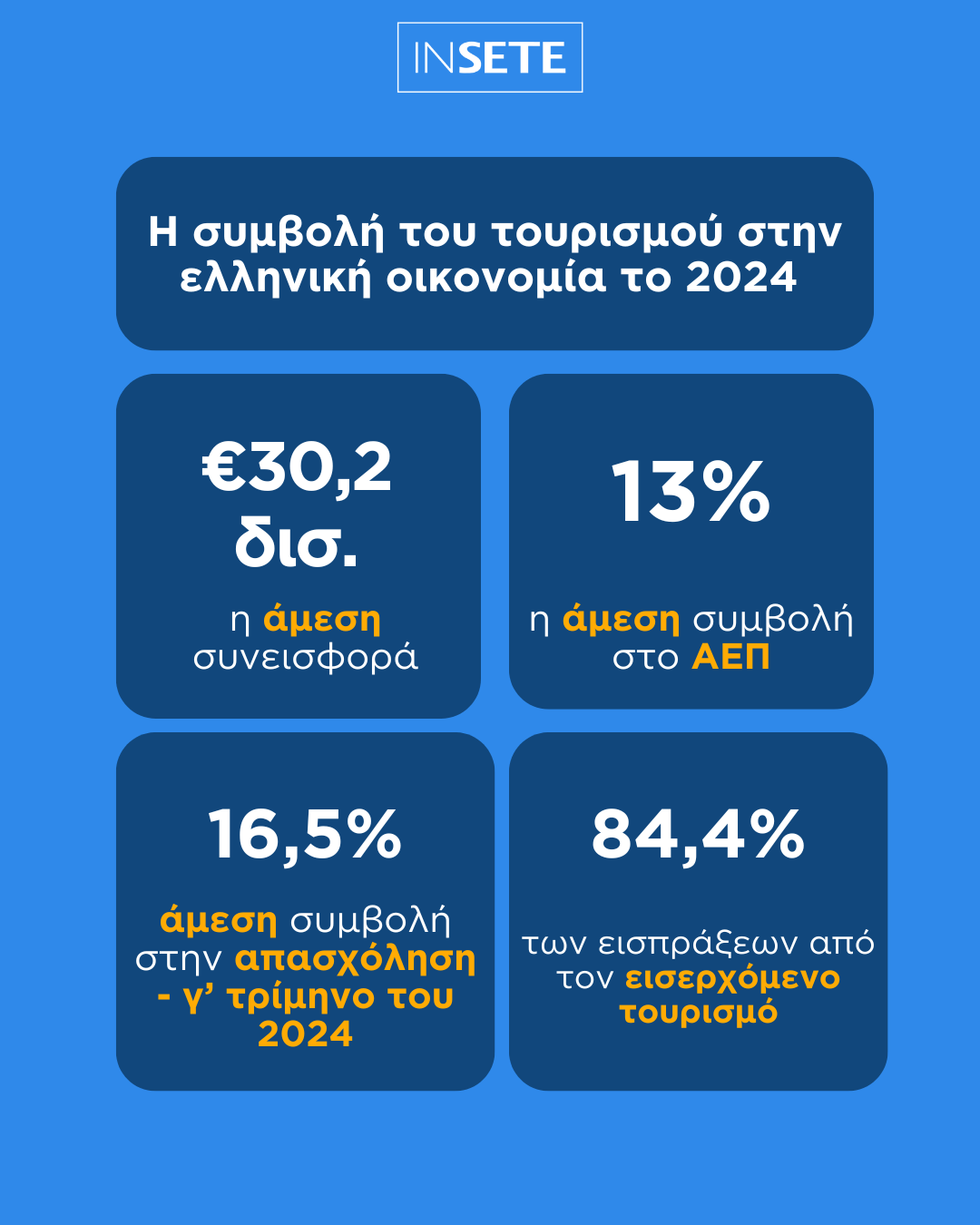 Τα στοιχεία προέρχονται από την τελευταία μελέτη του Ινστιτούτου του Συνδέσμου Ελληνικών Τουριστικών Επιχειρήσεων (ΙΝΣΕΤΕ) με θέμα «Η συμβολή του τουρισμού στην ελληνική οικονομία το 2024», σύμφωνα με την οποία αν συνυπολογιστεί και η έμμεση συνεισφορά του τομέα, το αντίστοιχο ποσοστό υπερβαίνει το 30% του ΑΕΠ. Η τουριστική δραστηριότητα παραμένει κατά κύριο λόγο εξαγωγική, αφού το 84,4% των εισπράξεων προέρχονται από τον εισερχόμενο τουρισμό καλύπτοντας το 71,5% του ελλείμματος του ισοζυγίου αγαθών (-35,66 δισ. € το 2024). Περαιτέρω, ο τομέας συνέβαλε άμεσα στην αιχμή, στο γ’ τρίμηνο του 2024, στο 16,5% της απασχόλησης.