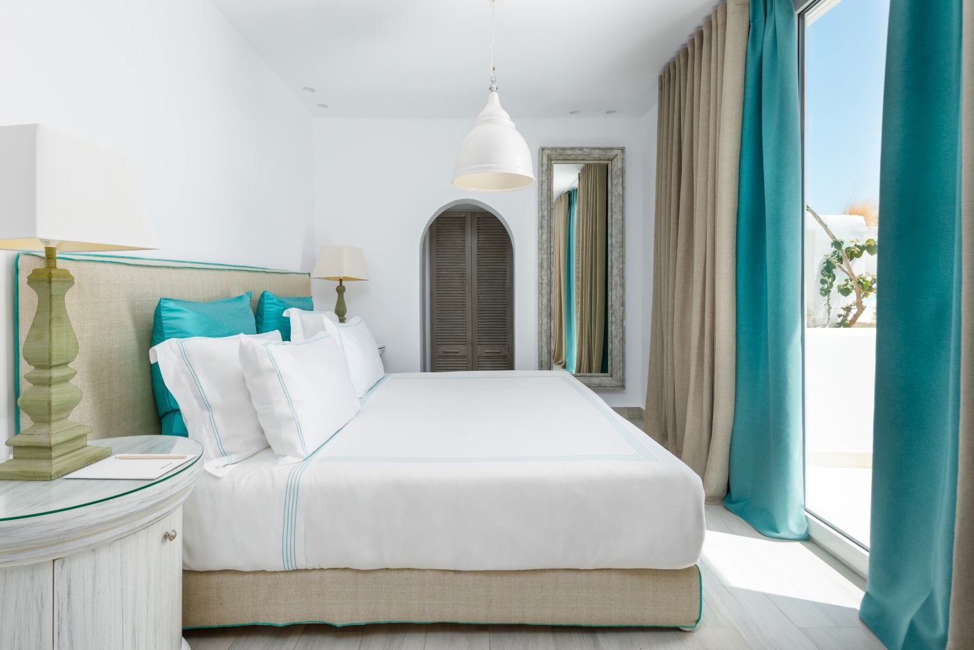 Το ξενοδοχείο περιλαμβάνει 26 κομψά δωμάτια και σουίτες, καθώς και 3 ιδιωτικές βίλες, που μοιράζονται μια απρόσκοπτη, μαγευτική θέα στο Αιγαίο. Η διακόσμησή τους εμπνέεται από την αύρα του νησιού και παντρεύει το χαρακτηριστικό μπλε του Nammos με λευκό μάρμαρο και χρυσές λεπτομέρειες, ενώ τα επιλεγμένα έπιπλα Loro Piana ενισχύουν την αίσθηση διακριτικής, αβίαστης πολυτέλειας.