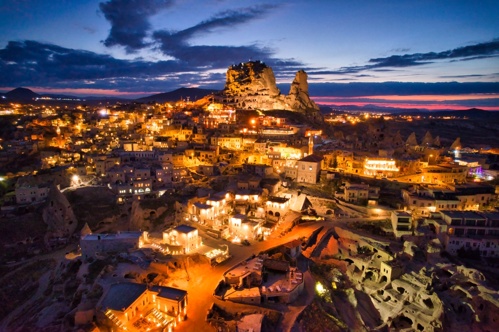 H Καππαδοκία, η χώρα των παραμυθιών, αποκτά έναν εντελώς νέο χαρακτήρα το βράδυ. Μισοφωτισμένες κοιλάδες και εμβληματικές νεραϊδοκαμινάδες δημιουργούν τις ιδανικές συνθήκες για ήσυχους βραδινούς περιπάτους κάτω από τον έναστρο ουρανό. Οι υπόγειες πόλεις Ντερίνκουγιου (Derinkuyu), Καϊμακλί (Kaymaklı) και Ουζκονάκ (Özkonak) προσφέρουν πρόσβαση μέχρι τις 9 μ.μ. Για πολλούς, η απόλυτη εμπειρία ξεκινά πριν από το ξημέρωμα.  Καθώς το σκοτάδι εξακολουθεί να τυλίγει τον ουρανό, δεκάδες αερόστατα φουσκώνουν αργά με τη βοήθεια θερμού αέρα, ανυψώνονται και αιωρούνται πάνω από τις νεραϊδοκαμινάδες. Το να παρατηρείς τον κόσμο να μεταμορφώνεται καθώς το σκοτάδι δίνει αργά τη θέση του στο φως της ημέρας, με φόντο τις νεραϊδοκαμινάδες, είναι μια αξέχαστη εμπειρία. Στην Καππαδοκία, τον πιο πρόσφατο τουρκικό προορισμό στον Οδηγό MICHELIN, οι ταξιδιώτες μπορούν επίσης να χαλαρώσουν σε ένα ξενοδοχείο-σπηλιά, απολαμβάνοντας τοπικά κρασιά.