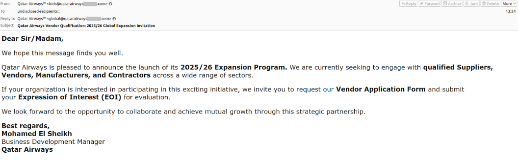 Τα εν λόγω παραπλανητικά emails εμφανίζονται ως επίσημη επικοινωνία από τα τμήματα προμηθειών διεθνών αεροπορικών εταιρειών, με στόχο να προσελκύσουν πιθανούς συνεργάτες ή προμηθευτές για ανύπαρκτα έργα. Μόλις ο παραλήπτης απαντήσει, οι κακόβουλοι χρήστες αποστέλλουν σειρά πλαστών εγγράφων, όπως φόρμες εγγραφής προμηθευτών και συμφωνητικά εμπιστευτικότητας (NDA), για να φανούν αξιόπιστοι. Οι επιχειρήσεις καλούνται επίσης να καταβάλουν ένα «Υποχρεωτικό Επιστρεπτέο Τέλος Εκδήλωσης Ενδιαφέροντος» (Mandatory Refundable Expression of Interest Deposit) ύψους αρκετών χιλιάδων δολαρίων, με το πρόσχημα ότι το ποσό αυτό θα «εξασφαλίσει μια θέση προτεραιότητας στο χρονοδιάγραμμα συνεργασίας» και θα επιστραφεί μόλις ολοκληρωθεί η «συνεργασία».