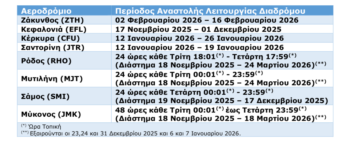 Συγκεκριμένα, οι ημερομηνίες για την αναστολή λειτουργίας των διαδρόμων, ανά αεροδρόμιο, παρουσιάζονται στον παρακάτω Πίνακα: