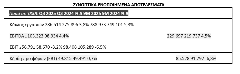 Σε επίπεδο εννεάμηνου , ο Κύκλος Εργασιών αυξήθηκε κατά 5,3% και ανήλθε σε €789 εκατ.. Το ΕBITDA για το εννεάμηνο του 2025 ανήλθε σε €229,7 εκατ., παρουσιάζοντας αύξηση 4,5%, ενώ τα Κέρδη μετά από Φόρους (ΕΑΤ) διαμορφώθηκαν σε €72,6 εκατ..