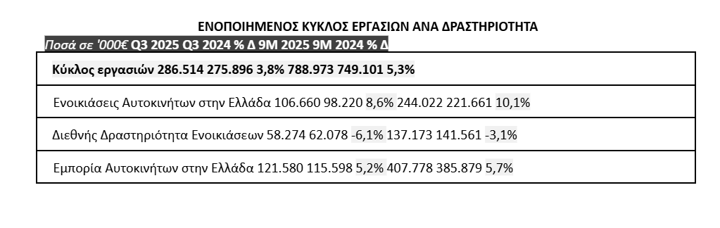 Συνολικά, η δραστηριότητα των βραχυχρόνιων και μακροχρόνιων μισθώσεων στην Ελλάδα, και στις χώρες που δραστηριοποιείται ο Όμιλος, απασχολεί στόλο σχεδόν 63.500 αυτοκινήτων με επενδύσεις σε περίπου 16.300 νέα αυτοκίνητα εντός του εννεάμηνου 2025.