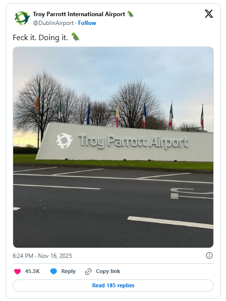 Όσοι επισκέφθηκαν τους επίσημους λογαριασμούς του αεροδρομίου, αντί για το «Dublin Airport», αντίκρισαν το «Troy Parrot Airport». Η λεζάντα έγραφε: «Feck it. Doing it.» («Στο καλό. Το κάνουμε»), μια φράση που αποτύπωνε την αυθόρμητη και παιχνιδιάρικη διάθεση πίσω από την κίνηση — η οποία πάντως έγινε δεκτή με ενθουσιασμό από τον κόσμο.