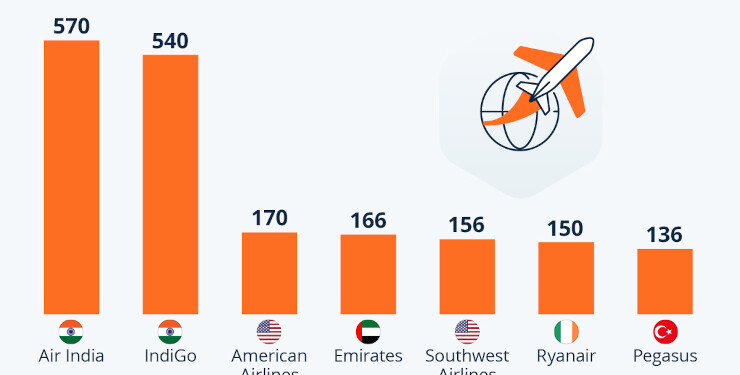 Το γράφημά μας καταδεικνύει ότι αυτός ο όγκος είναι υπερτριπλάσιος σε σχέση με τις παραγγελίες άλλων μεγάλων διεθνών εταιρειών, όπως η Ryanair (Ιρλανδία), η Southwest Airlines (ΗΠΑ), η Emirates (ΗΑΕ) και η American Airlines (ΗΠΑ), που κινούνται μεταξύ 150 και 170 αεροσκαφών η καθεμία. Πέρα από την ανάγκη εκσυγχρονισμού του στόλου και την ανάκαμψη μετά την COVID-19, η αυξανόμενη ζήτηση για αεροπορικά ταξίδια στην Ινδία εξηγεί αυτή την εντυπωσιακή αύξηση στις παραγγελίες αεροσκαφών από τις αεροπορικές της χώρας.