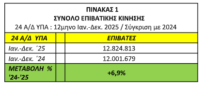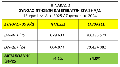 Συνολικά, για τα 39 αεροδρόμια της χώρας (24 ΥΠΑ, 14 FRAPORT GREECE, ΔΑΑ) τα στατιστικά Ιανουαρίου-Δεκεμβρίου 2025 καταγράφουν άνοδο 4,9% στην επιβατική κίνηση και 4,1% στις κινήσεις αεροσκαφών.