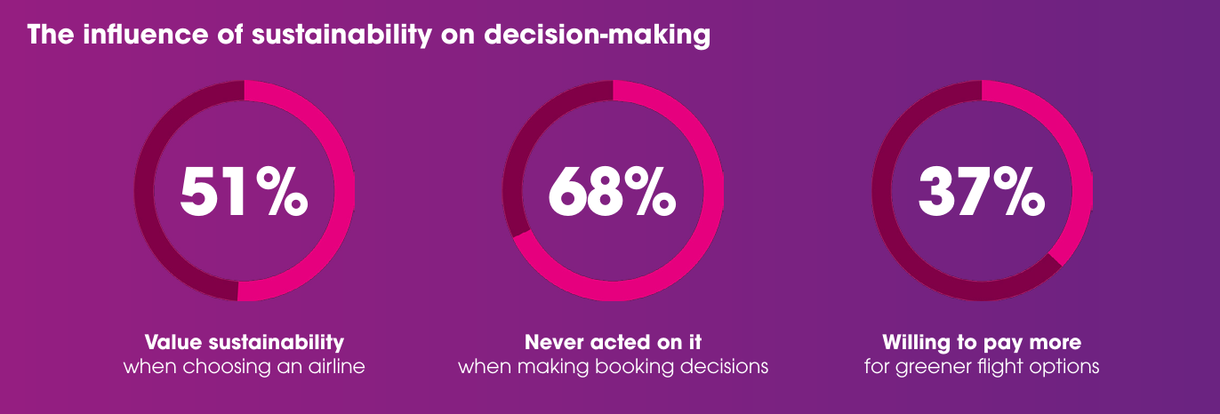 Παράλληλα, περισσότεροι από τα δύο τρίτα των ερωτηθέντων (68%) αναφέρουν ότι δεν έχουν πραγματοποιήσει κράτηση βάσει των «πράσινων» διαπιστευτηρίων μιας εταιρείας. Την ίδια στιγμή, περίπου το 42% επισημαίνει ότι οι αγορές που πραγματοποιούν εντός της πτήσης επηρεάζονται από ζητήματα βιωσιμότητας, όπως η μείωση της χρήσης πλαστικού και η ανακύκλωση.